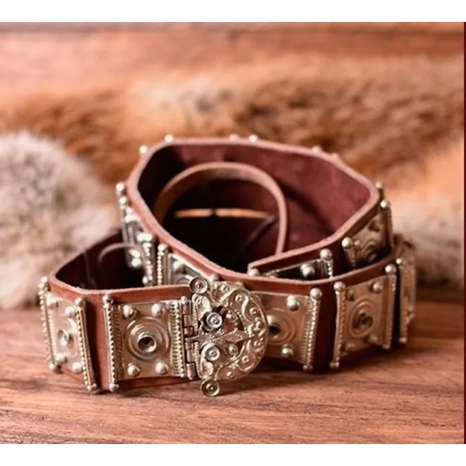 The belt has two fittings to hang the pugio from. It is made of cow leather and tin-plated brass. It is suitable for a waist circumference between 97 and 116 cm, although it can be adjusted to larger waist circumferences by punching extra belt holes. Weight: approx. 800 g.