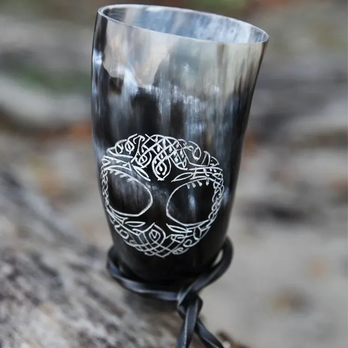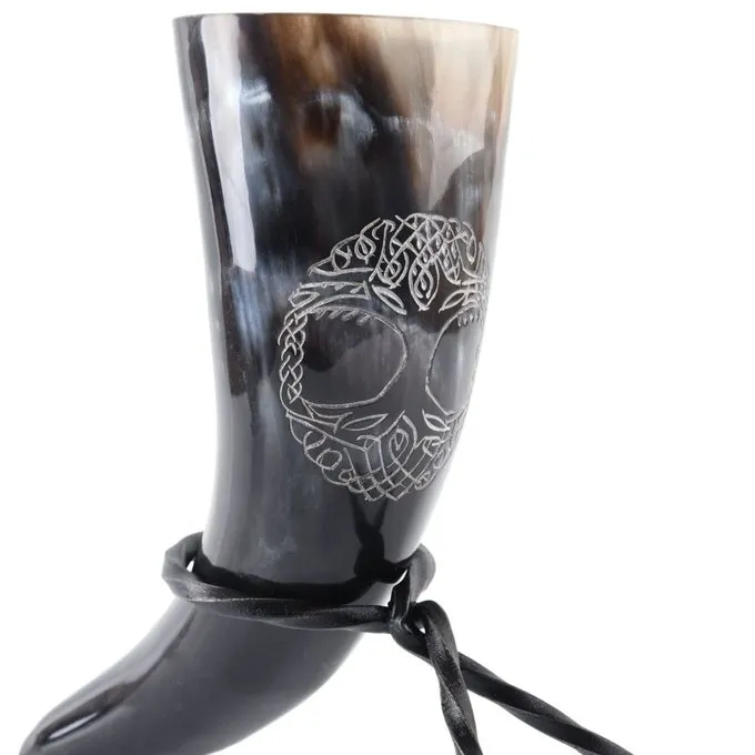 Over the centuries, the drinking horn has been used by different peoples as a cup during ceremonies and celebrations. The use of the drinking horn is even mentioned in the Edda. This horn is perfect for Viking reenactment, home decor, LARP and makes a wonderful gift. It is also ideal for festivals. This drinking horn is hand made from buffalo horn and is polished. There is a layer of varnish on the inside so that you can drink from the horn. It comes with a metal stand with which you can place it on the table. The horn is engraved with Yggdrasil, the tree of life in Norse mythology. Yggdrasil is evergreen and connects the earth, heaven and underworld. It is a sacred tree and symbolizes knowledge, life, immortality. A popular symbol in paganism.