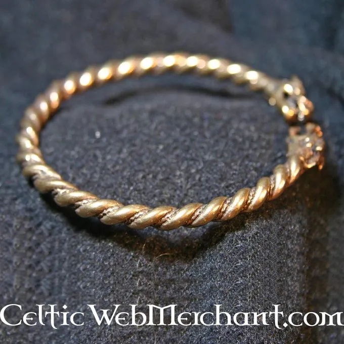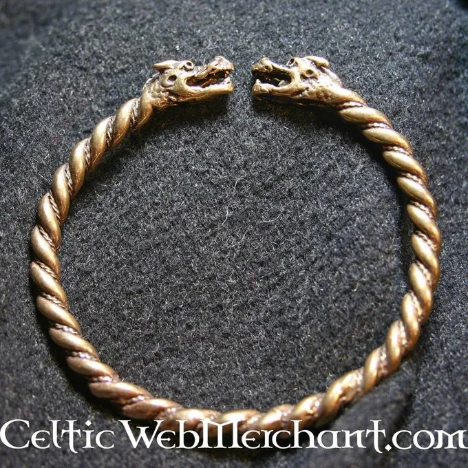 This bracelet is made of twisted bronze and the ends are decorated with a dragon`s head. It weighs 30,2 g and has a diameter of approx. 6,5 cm.