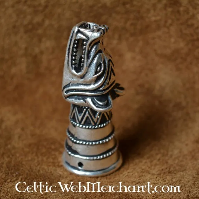 This drinking horn decoration is a replica of a 14th century original excavated at Castle Douglas in Scotland (Dumfries, Galloway). This 13th century drinking horn decoration refers back to the Viking period and was possibly based on an even older original. This drinking horn decoration is made of bronze and it is 5,7 cm long, 2,2 cm wide and has a shaft of 4 cm. It is suitable for drinking horns with a diameter of 1,9 cm at the tip.