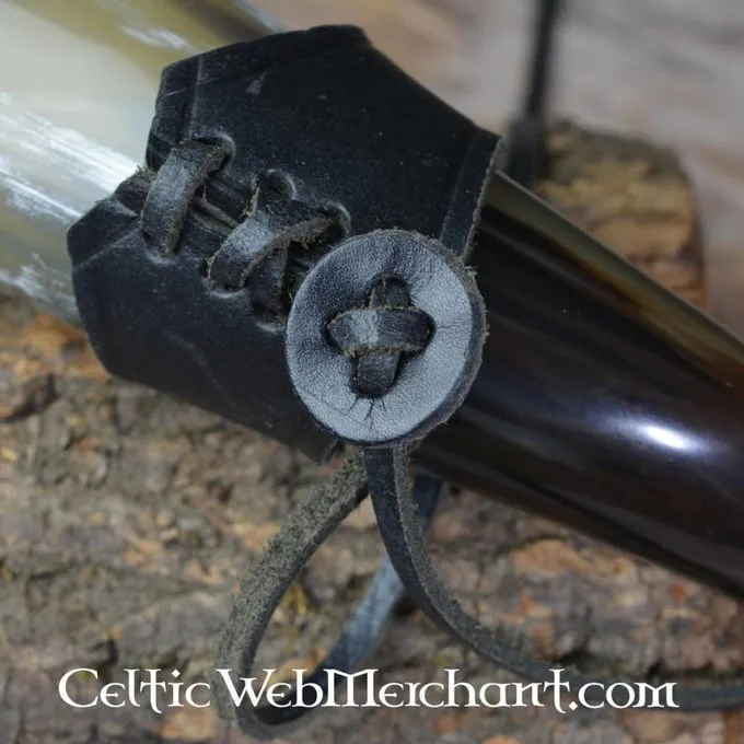 This holder for drinking horns is made of 8 mm thick, round steel. It is available in two sizes. Size M is suitable for a horn of 0,2 to 0,4 litre. Size L is suitable for a drinking horn of 0,5 to 0,7 litre. It is available in the colour brown or black.