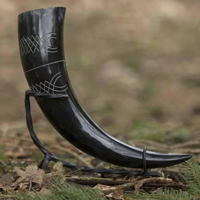Drinking horns were already used by the Greeks and Romans in antiquity and during the Middle Ages drinking horns had a ritual and ceremonial function. This beautiful drinking horn is made from natural horn that has been selected for its dark color. You can fill this horn with no less than 0.5 liters of your favorite beverage! The exterior is polished so that it has a smooth, luxurious surface and it is engraved with a symmetrical pattern. The inside of the horn has been treated to make it suitable for drinking, and a wax layer has been applied for extra durability. This drinking horn is perfect for festivals, re-enactment, LARP or just for a lazy evening on the couch.