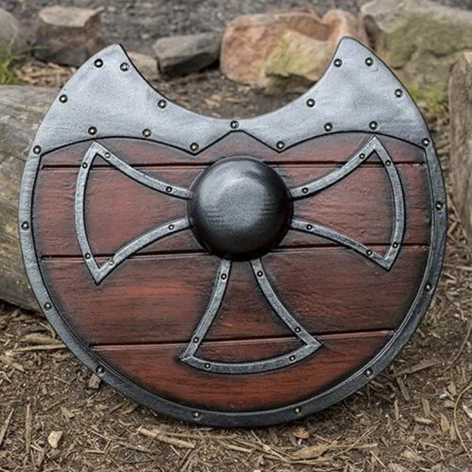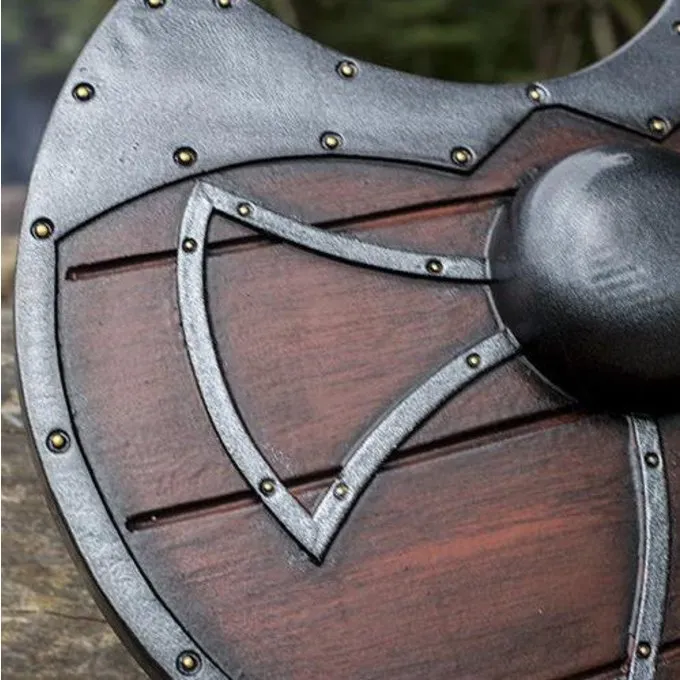 This larp shield is made after historical pieces. This LARP shield is handmade and colored, so every item is unique. Because of the material we do not recommend leaving it in the sun for a longer period of time.
