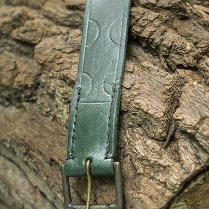 The belt is beautifully decorated with a motif that is imprinted deep into the leather. The belt has an exciting appearance, it consists of different leather pieces that are connected to each other with small square pieces.