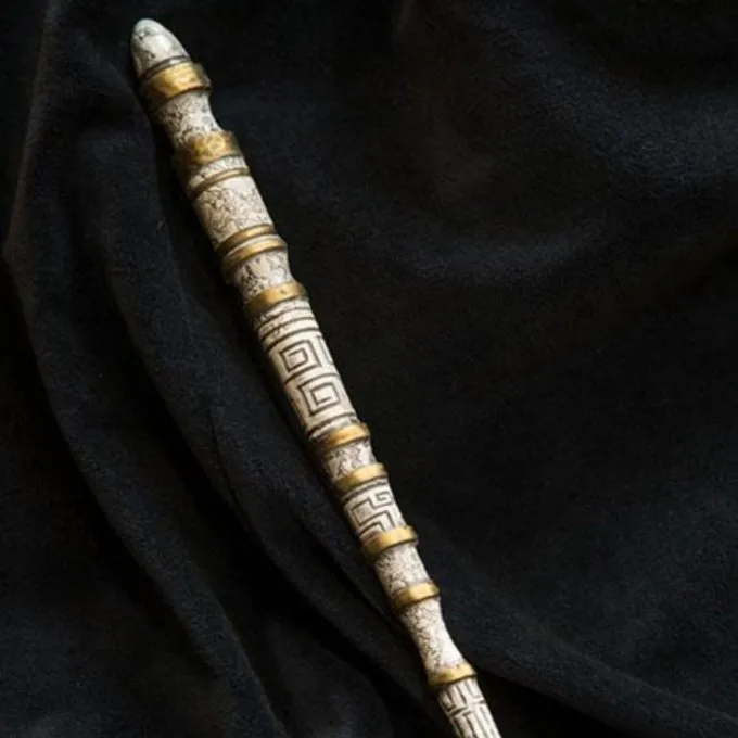 This wand is lifelike designed and painted by hand so that it appears to be made of ivory with gold bands. This wand shows engraved magic symbols in a mysterious ancient script. A magic wand for true mystics! This LARP weapon is made of a flexible steel core coated with polyurethane foam. The wand is fully bendable and adaptable to your character. This wand is very low maintenance and is perfect for Harry Potter’s LARP or Cosplay and other magical worlds