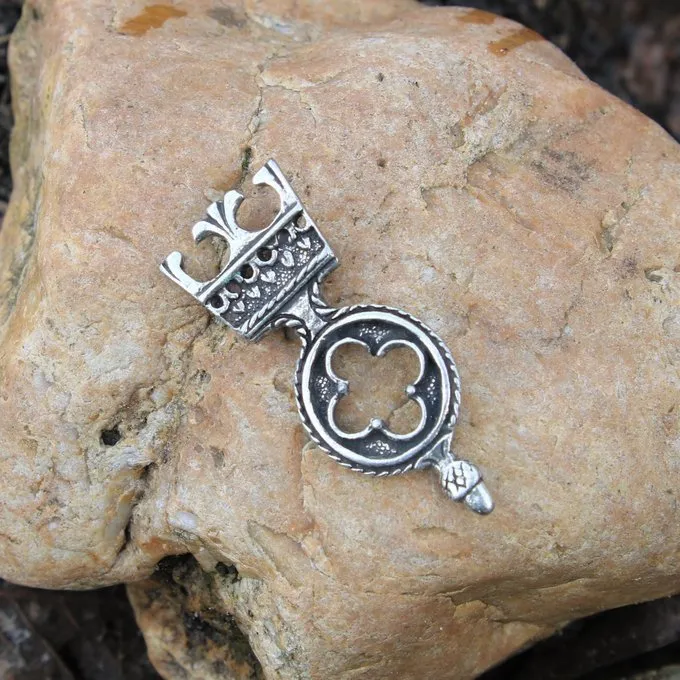 This extremely detailed belt end is made after several medieval originals. It is made in the Gothic style.