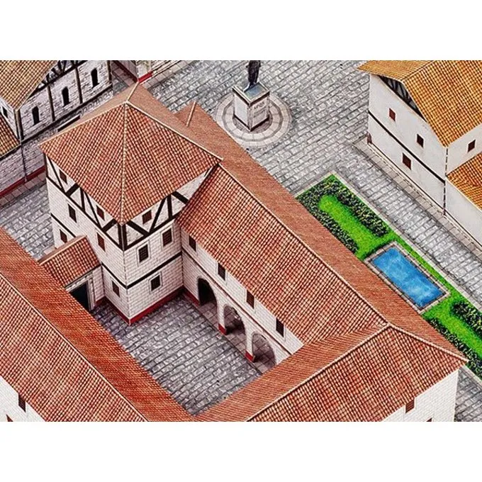 This model building kit is made after Roman city maps from the 1st and 2nd century AD. The kit has an average level of difficulty and is made of A3 carton. The Roman city model is approx. 42 cm long and made on a scale of 1:87. Roman cities have a uniform city plan, as a result Romans from other cities could easily get around. The city could also easily be defended during times of war. In the centre of the model city stands a bronze statue: possibly a senator or politician from the area. The streets are tiled with long tiles, typically Roman, with high pavements. The centre has a temple and the building next to it has several shops with the typical Roman counters. The street has two beautiful villas, both with a spacious inner garden (atrium) and a pond. With this building kit you can also look inside the buildings!