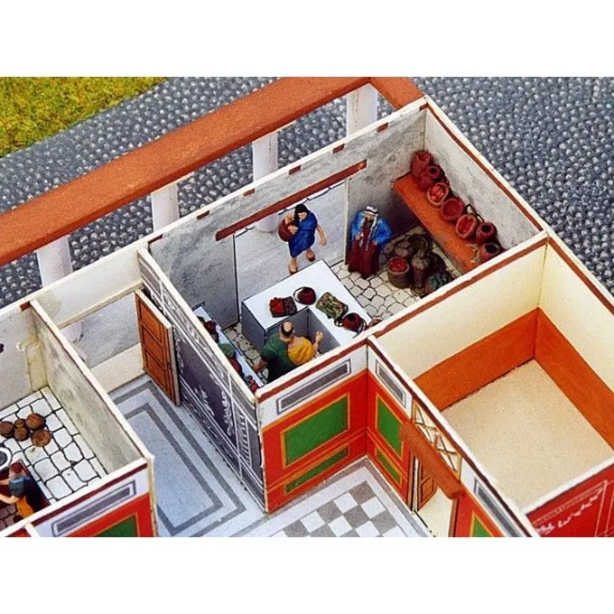 This building kit is based on Roman villas as they were built in South Europe, North Africa and Asia. The roof is extra high to provide more shadow. The roof is carried by columns that were elaborately decorated. You can look inside this model! The floors are made of marble tiles or mosaics. The walls are painted with frescoes.