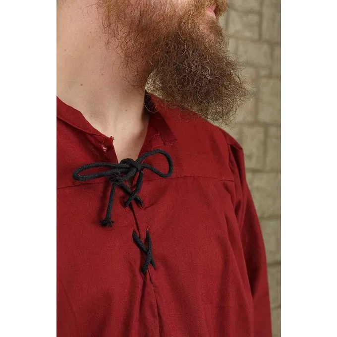 The medieval shirt Simon is made of light cotton and therefore perfect for keeping cool on a warm day. The shirt has a small stand-up collar with a tie front and sleeves that can be adjusted to the wearer by tying at 3 points on the forearm. The shirt is a perfect basis for a medieval costume at, for example, a LARP meeting or medieval festival.