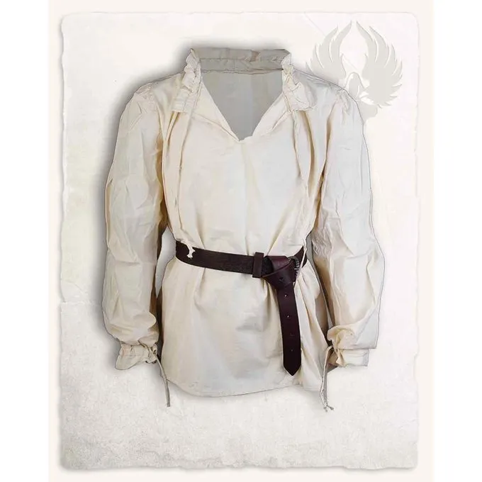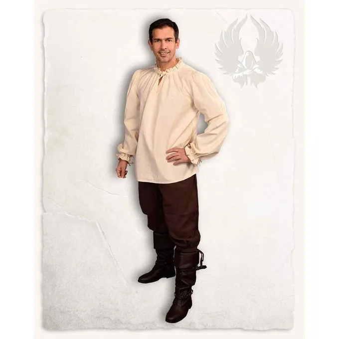 Made of light cotton and sewn in historical patterns, pirate shirt Bastian is perfect for pirate costumes on warm days. This shirt is very suitable as a first layer over your skin – cotton absorbs moisture very well. The cut is wide and is therefore suitable for warm and sunny days. The collar is decorated with quillings and has a lacing just below. The wide-cut sleeves close just below the wrist and give the shirt a casual look.