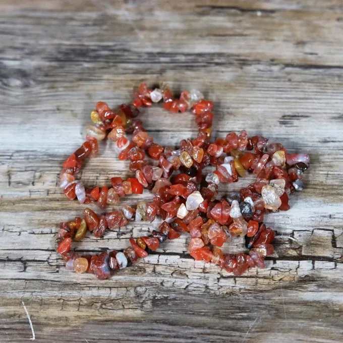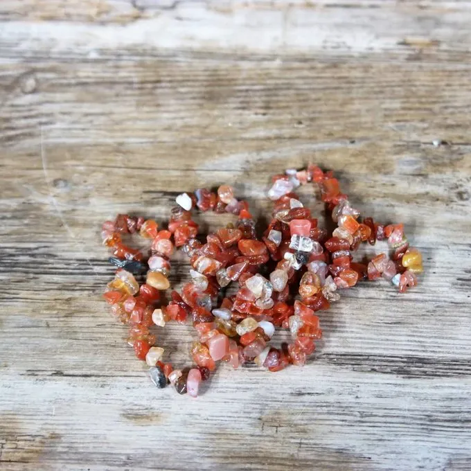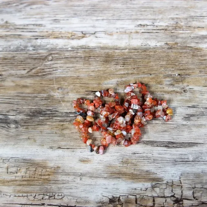 This necklace consists of small pieces of carnelian. Carnelian has been used for millennia to make jewelry and it is a natural quartz. Because of the low price of carnelian but the luxurious look it can be used as a semi-precious stone for historical reconstructions instead of the more expensive amber. Wearing carnelian would bring the wearer success, helps against depression, quarrel and gives motivation and self-confidence.