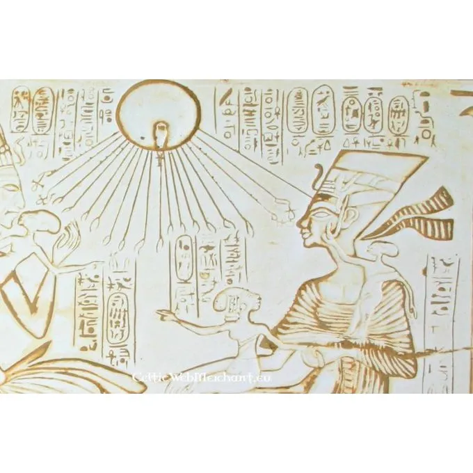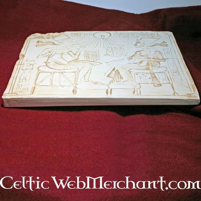 This relief is made after an altar piece from Tel Amarna. The relief shows detailed depictions of pharaoh Achnaton, his wife, queen Nefertiti, and their three daughters. The original is nowadays part of the collection of the Neues Museum in Berlin.