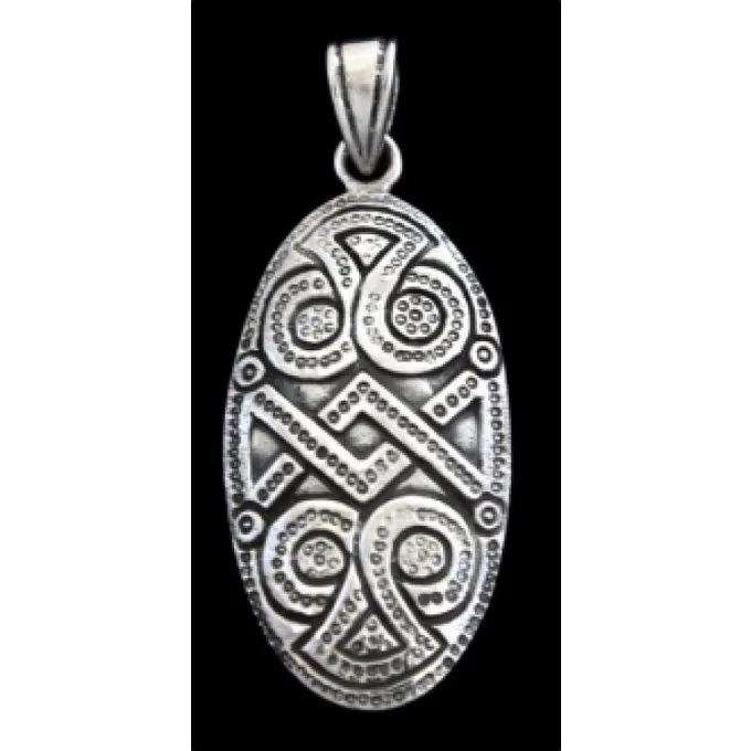 This pendant is a replica of a 9th century shield brooch that was worn by women. The front of this pendant is quite orbal and it is made of Sterling silver 925. It measures approx. 4.4 x 1.7 cm.