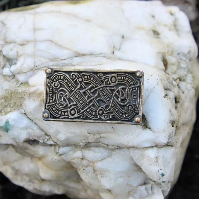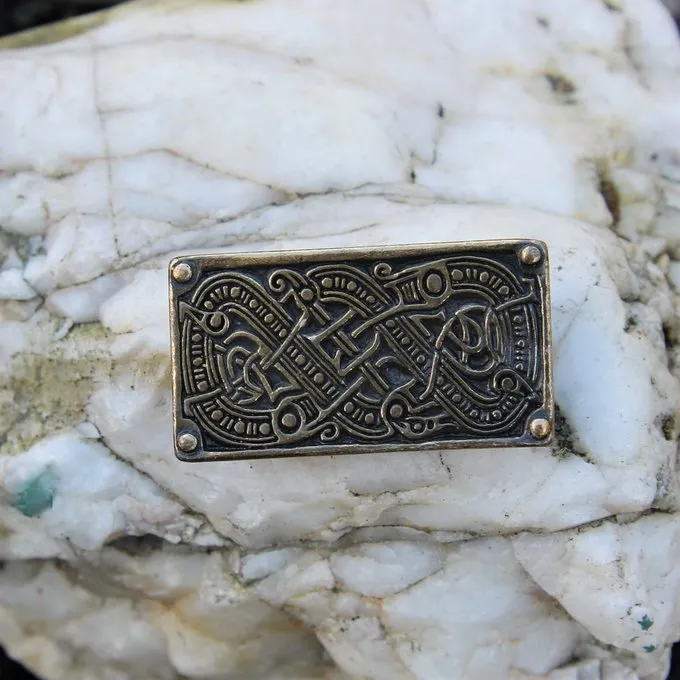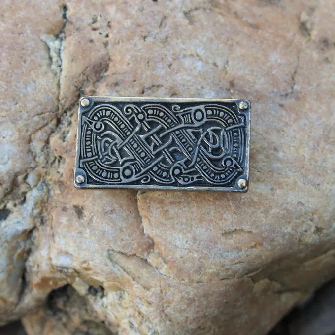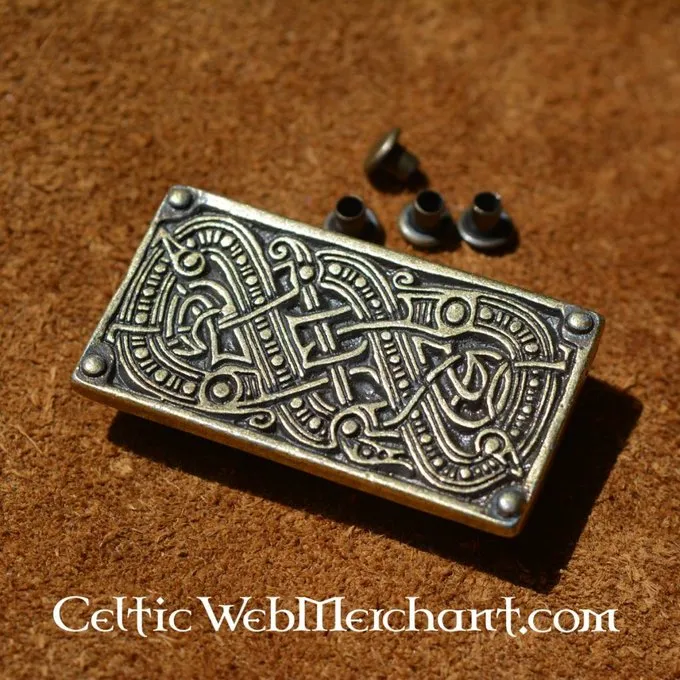 This belt fitting is based on a Germanic original from the 6th century, found in Valsgärde, Sweden. The Valsgärde period can be seen as the predecessor of the ‘Viking Age’. The belt fitting consist of various knot motives that end in dragon heads.