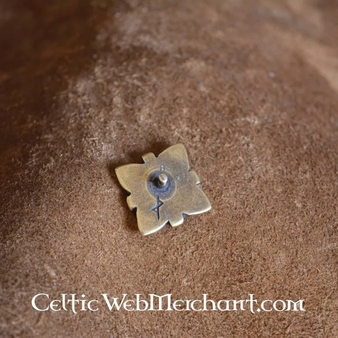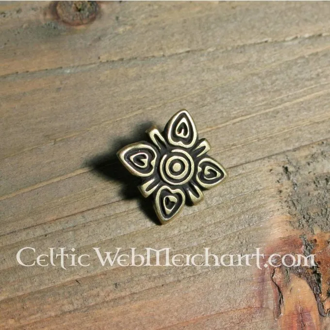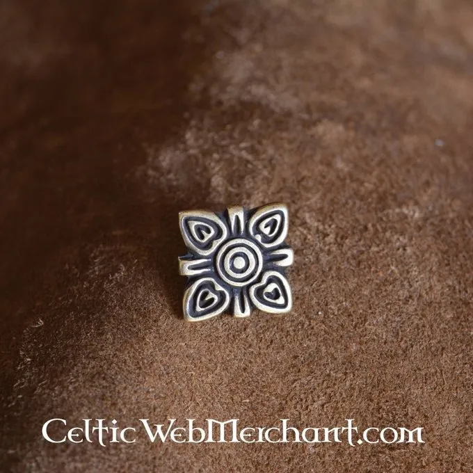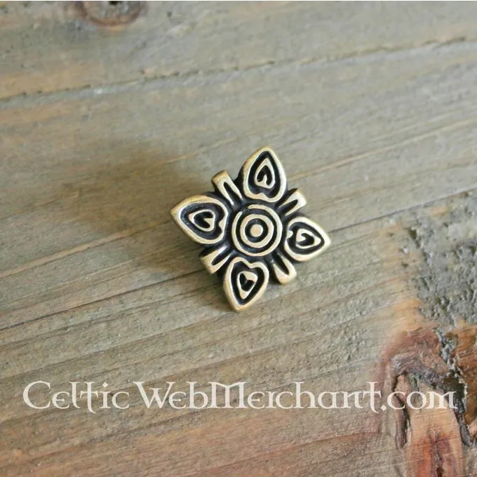 This fitting can be used for decorating belt ends and bags. It is based on an original from Birka from the 10th century. It measures 2×2 cm and is bronze coloured.