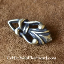 This Viking belt fitting is made in the Borre art style (825-970) and is based on an original fitting excavated in the Viking trading town Birka. The fitting shows a mirrored knot and a triangular shape. It can also be used for decorating leather bags or even shoes. It measures 1,7 x 1,6 cm and is silver coloured or brass coloured.