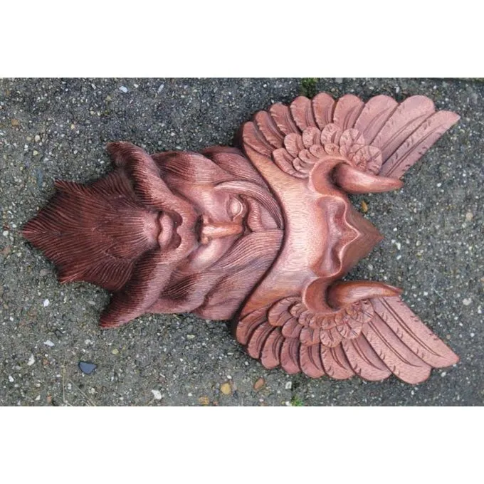 This wall decoration shows the Nordic upper god in all his glory. He has a long beard and a moustache and he wears a helmet. This woodcarving is completely hand made and it measures 40 x 25 cm.